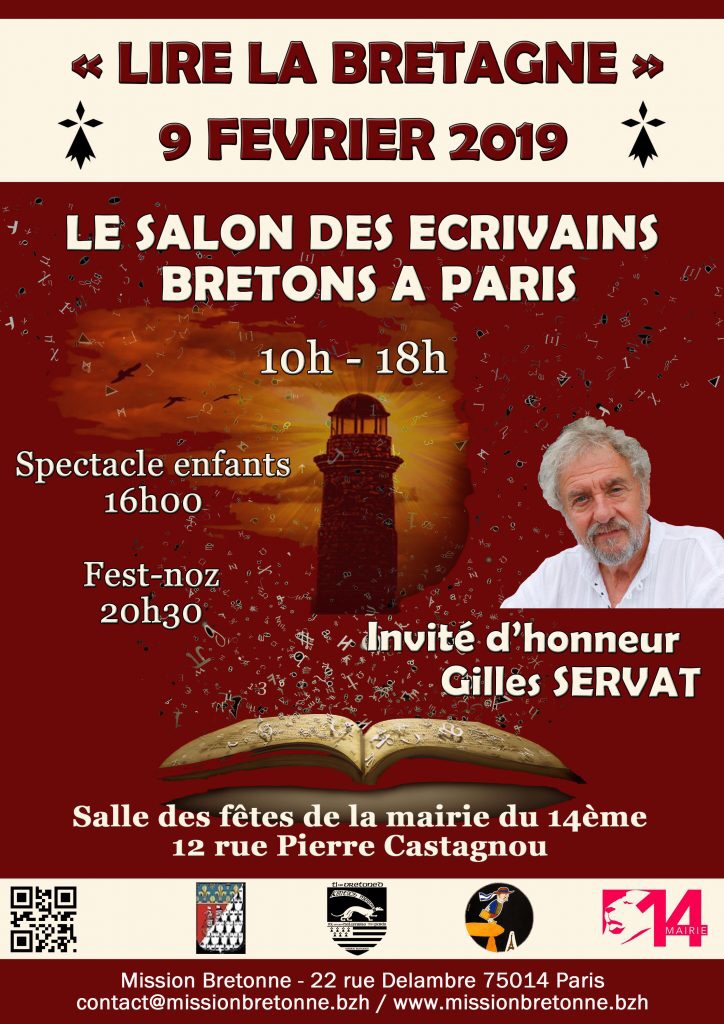 Le Salon des écrivains bretons à Paris, appelé aussi Salon « Lire la Bretagne », est un rendez-vous annuel qui a lieu généralement en février à la salle des fêtes de la Mairie du XIVème arrondissement. Il réunit une quarantaine d’écrivains venus présenter leurs ouvrages et est l’occasion d’assister à des conférences, des expositions, des dédicaces. De grands écrivains font régulièrement le déplacement. Le salon est aussi l’occasion d’un concours de nouvelles. 2019 sera la sixième édition du salon Lire la Bretagne.